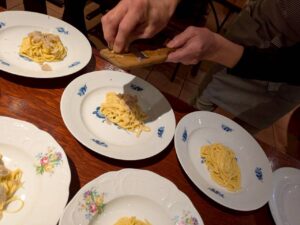 今年の忘年会はオステリア・アンジョウさんで行いましたが、シェフ自ら、自家製手打ちパスタに白トリュフをかけてくださり、その香りのよいこと!