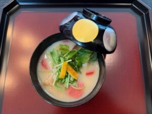 青蓮院門跡近くの懐石料理屋さんでいただいた白みそのお椀にとても感激し、自宅でも再現してみたくなり、今年の元日は白みそのお雑煮にしてみました。